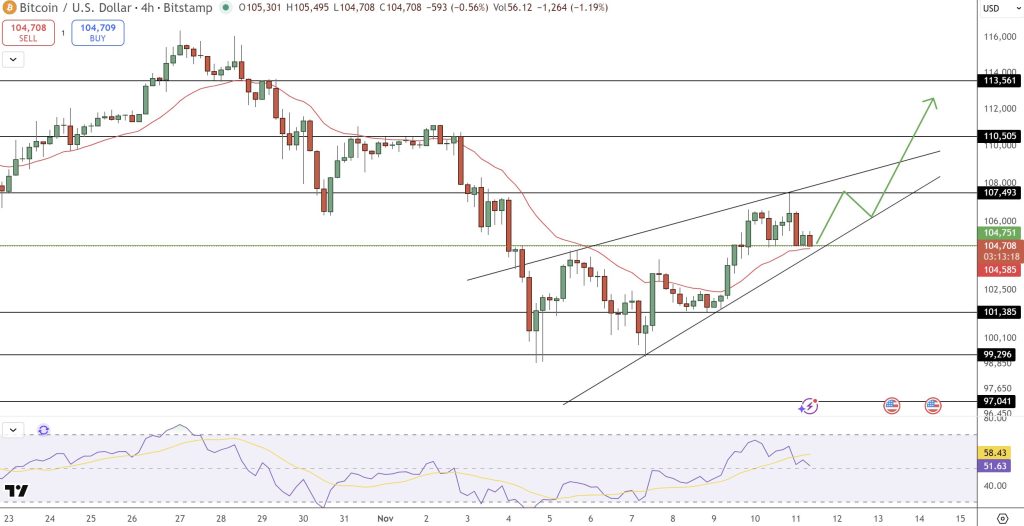 보호하는 사람은 패자입니다. 비트코인(BTC/USD) 기술 설정은 돌파를 선호합니다. 차트에서 비트코인(BTC/USD)은 $104,700 근처의 상승 쐐기 패턴 내에서 통합되어 잠재적인 돌파에 대한 준비를 신호합니다. 두 쌍은 20-EMA 및 200-EMA 위에 머물며 약 $104,000의 확고한 지지를 나타냅니다. 가격 차트 – 출처: TradingviewMomentum은 RSI가 51에 가까워 안정화되고 있어 상승 여지가 있음을 시사합니다.