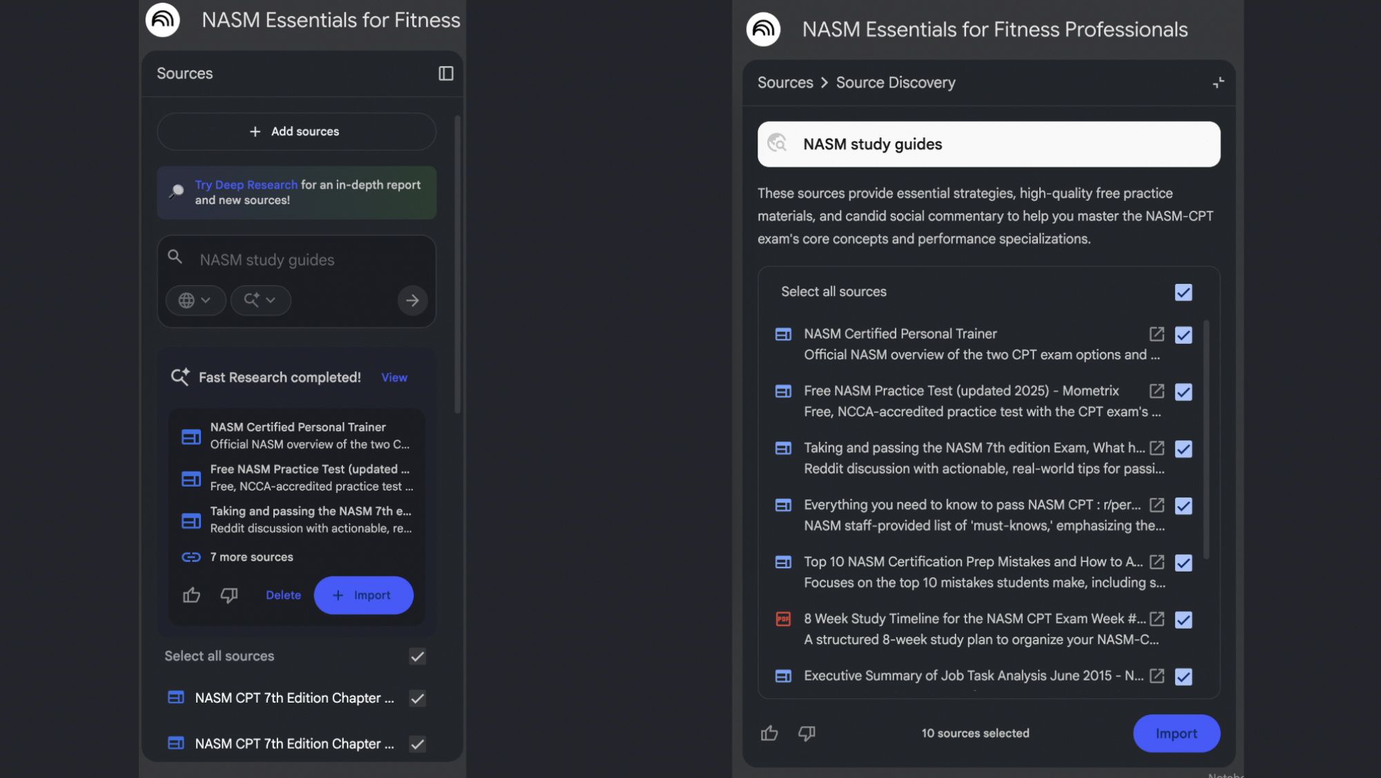 이번 업데이트 이전에는 자신만의 소스를 찾아 입력하는 것은 전적으로 사용자의 몫이었습니다. 빠른 조사 도구도 비슷합니다. 소스를 찾고 긴 보고서를 생성하는 대신 고려해야 할 몇 가지 새로운 소스를 제안할 뿐입니다. 출처: Google 심도 있는 조사 모드를 사용하든 빠른 조사 모드를 사용하든 관계없이 소스가 마음에 들지 않으면 선택을 취소할 수 있지만 검토하기는 어렵습니다. 다가오는 개인 훈련 인증 시험을 공부하기 위해 설정한 노트북에서 시험해 보았습니다. 위 왼쪽에 표시된 “Free NASM Practice Test”와 같은 다양한 제목이 표시됩니다.